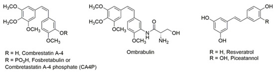 Structures of stilbenoids combrestatin, ombrabulin, resveratrol and piceatannol.