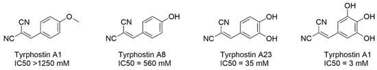 Binding studies indicated that the B-ring of flavones is placed near the prosthetic group of CYP1 enzymes, with C-3′ and C-4′ being closest to the reactive heme iron [14,16]. The A-ring of flavones is positioned further away from the prosthetic group, and is thus less prone to regioselective conversions. It may play a role in stabilising flavones as substrates in the enzyme pocket. Flavones that contain multiple methoxy groups tend to have a higher metabolic turnover by CYP1 enzymes [21,22]. Studies on flavones as potential substrates for CYP1 enzymes have indicated the 4′-OMe substitution on the B ring as a target for regiospecific O-dealkylation [16,21,22,23,24,25]. Further, if a 4′-OH substitution is present on the B ring, CYP1 enzymes catalyse regiospecific hydroxylation of the C-3′ [23,26]. In all cases, the result of the CYP1-mediated bioconversion is the formation of a catechol-type substitution on the B-ring with a concurrent increase in cytotoxicity. This structure–activity relationship reflects a well-known pattern: tyrphostin A1, which bears a methoxy group in the para-position of its aromatic ring (Figure 2), is completely inactive as a tyrosine kinase inhibitor, whereas increasing the number of hydroxyl substituents on the ring resulted in a 35-fold increase in potency [27].