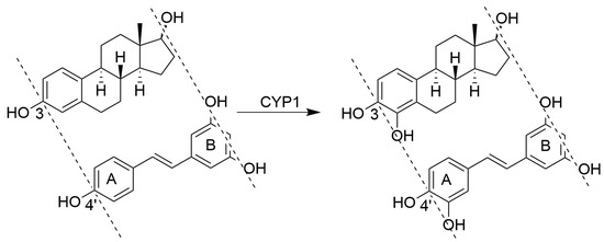The structure of resveratrol can be mapped onto that of oestradiol (Figure 3) with the C-3 in oestradiol corresponding to the C-4′-position in resveratrol. Previous studies in our lab have shown that CYP1B1, an enzyme that has oestradiol as its natural substrate, also catalyses the conversion of resveratrol into piceatannol (E)-3, 4,3′,5′-tetrahydroxy stilbene [28]. Piceatannol differs from resveratrol by having one additional aromatic hydroxyl group, thus creating the catechol motif that is commonly found in kinase inhibitors [29,30].