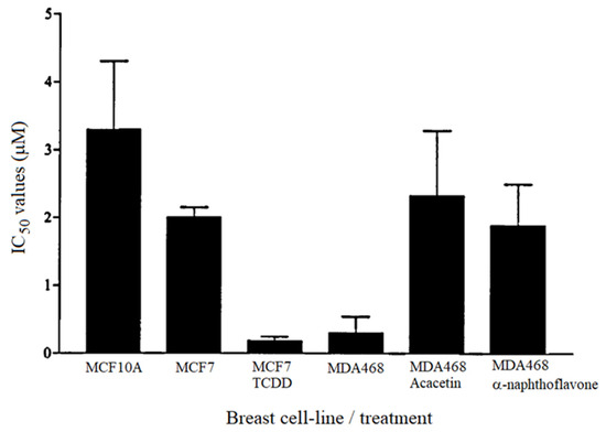 DMU224 showed to be highly toxic for all cell lines including non-tumour MCF10A cells, and the IC50 values were 0.06 µM for both MCF7 and TCDD-induced MCF7, 0.005 µM for MDA-468, and 0.06 µM for MCF10A.