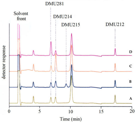 Identification of DMU281 and DMU214 as metabolites of CYPIB1-mediated metabolism of DMU212 by co-elution with authentic standards. A: CYP1B1 incubate extract, B: extract spiked with DMU215 (Combretastatin A4), C: extract spiked with DMU214, D: extract spiked with DMU281.