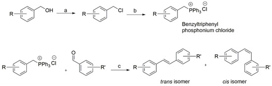 The synthesis of stilbenes by Wittig reaction, the most widely used approach, typically involves the condensation of equimolar quantities of substituted benzaldehyde with phosphorus ylide generated in situ when a phosphonium salt is treated with a strong base such as n-butyllithium Scheme 1 (See Supplementary Materials for details).
