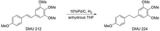 The dihydrostilbenoid DMU224 was prepared by catalytic hydrogenation of stilbene DMU212, to transform the ethene bond to ethylene bond present between the two aryl rings in the presence of 10% palladium on carbon in anhydrous THF. The mixture was stirred at room temperature for 20 min, monitored by TLC to show the appearance of a new non-polar spot in comparison to DMU212. Removal of catalyst by filtration followed by trituration afforded a white solid in 48% yield.