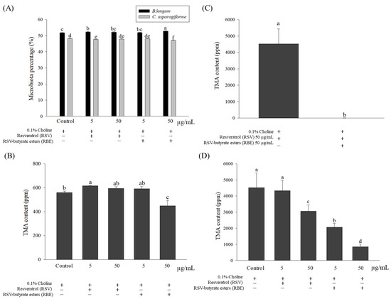 Effects of resveratrol (RSV) and RSV-butyrate esters (RBE) on bacterial cultures: (A) effects on the growth of C. asparagiforme and B. longum expressed as bacterial population percentage (%); (B) effects on the metabolic choline production of trimethylamine (TMA; ppm) by C. asparagiforme; (C) effects for a single culture of C. asparagiforme or co-culture of C. asparagiforme and B. longum of choline metabolized into TMA (ppm); and (D) effects of RSV and RBE treated with 50 μg/mL each on the metabolic choline yield of TMA in a single culture of C. asparagiforme and a co-culture of C. asparagiforme and B. longum. Different letters indicate that the statistically different from other (p < 0.05).