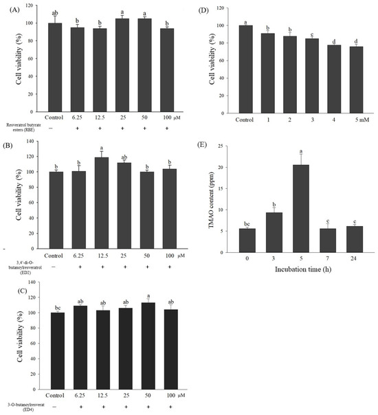 Effects of different concentrations of samples on HepG2 cell lines treated with (A) resveratrol butyrate esters (RBE); (B) 3,4′-di-O-butanoylresveratrol (ED2, di-butyric acid derivative); (C) 3-O-butanoylresveratrol (ED4); and (D) trimethylamine (TMA). (E) Effects of TMA treatment at different times on the amount of trimethylamine oxide (TMAO) produced by HepG2 cell lines. Different letters indicate that the statistically different from other (p < 0.05).