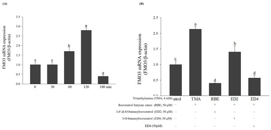 Effects of the different samples treated on flavin-containing monooxygenase-3 (FMO3) mRNA gene expression in the HepG2 cell line: (A) trimethylamine (TMA) treatment for 0–180 min; (B) resveratrol butyrate esters (RBE), 3,4′-di-O-butanoylresveratrol (ED2, di-butyric acid derivative), 3-O-butanoyl resveratrol (ED4), and TMA treatment for 180 min. Different letters indicate that the statistically different from other (p < 0.05).