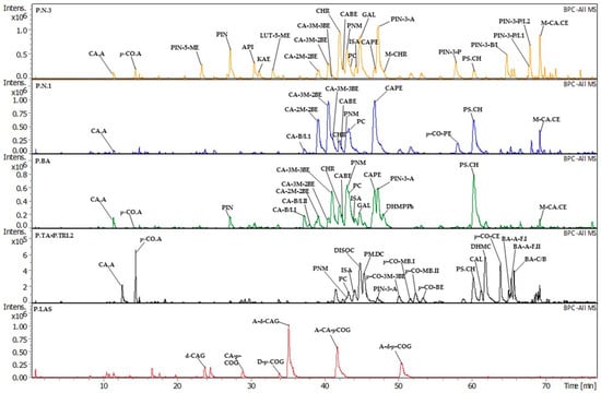 LC-MS chromatograms of Populus buds EtOH extracts representing five chemical groups (negative mode, base peak chromatograms). Figure legend: Lanes: orange—P.N.3—P. nigra, sample 3 (flavonoid type); blue—P.N.1—P. nigra, sample 1 (hydroxycinnamic monoesters type); green—P.BA—P. balsamifera (hydroxycinnamic monoesters + flavonoid type); black—P.TA × P.TRI.2—P. tacamahaca × P.trichocarpa, sample 2 (mixed type); red—P.LAS—P. lasiocarpa (hydrocinnamic acids glycerides type). Component abbreviations: A-CA-p-COG—2-Acetyl-1-caffeoyl-3-p-coumaroylglycerol; A-d-CAG—2-Acetyl-1,3-di-caffeoylglycerol; A-d-p-COG—2-Acetyl-1,3-di-p-coumaroylglycerol; API—apigenin; BA-A-F.1—Balsacone A/B/E/F isomer I; BA-A-F.2—Balsacone A/B/E/F isomer II; BA-C/B—Balsacone C or D; CA.A—Caffeic acid; CA-2M-2BE—Caffeic acid 2-methyl-2-butenyl ester; CA-3M-2BE—Caffeic acid 3-methyl-2-butenyl ester; CA-3M-3BE—Caffeic acid 3-methyl-3-butenyl ester; CA-B/I.1—Caffeic acid butyl or isobutyl ester isomer I; CA-B/I.2—Caffeic acid butyl or isobutyl ester isomer II; CABE—Caffeic acid benzyl ester; CAL—2′,6′-Dihydroxy-4′,4-dimethoxydihydrochalcone (calomelanone); CA-pCOG—Caffeoyl-p-coumaroylglycerol; CAPE—Caffeic acid benzyl ester; CHR—Chrysin; d-CAG—di-Caffeoylglycerol; DHMC—2′,6′-Dihydroxy-4′-methoxydihydrochalcone; DHMPPh—2′,6′-Dihydroxy-4′-methoxypentanophenone; DISOC—Isosakuranetin dihydrochalcone; d-p-COG—1,3-di-p-Coumaroylglycerol; GAL—Galangin; ISA—Isosakuranetin; KAE—Kaempferol; LUT-5-ME—Luteolin 5-methyl ether; M-CA.CE—Metoxycinnamic acid cinnamyl ester; M-CHR—Methoxychrysin; P.C—Pinocembrin chalcone; p-CO.A—p-Coumaric acid; p-CO-3M-3BE—p-Coumaric acid 3-methyl-3-butenyl ester; p-CO-BE—p-Coumaric acid benzyl ester; p-CO-CE—p-Coumaric acid cinnamyl ester; p-CO-MB.I—p-Coumaric acid 3-methyl-2-butenyl or 2-methyl-2-butenyl ester isomer I; p-CO-MB.II—p-Coumaric acid 3-methyl-2-butenyl or 2-methyl-2-butenyl isomer II; p-CO-PE—p-Coumaric acid phenethyl ester; PIN—Pinobanksin; PIN-3-A—Pinobanksin 3-acetate; PIN-3-P—Pinobanksin 3-propanoate; PIN-3-B/I—Pinobanksin 3-butanoate or -isobutanoate; PIN-3-P/I.1—Pinobanksin 3-pentanoate or -isopentanoate isomer I; PIN-3-P/I.2—Pinobanksin 3-pentanoate or -isopentanoate isomer II; PIN-5-ME—Pinobanksin 5-methyl ether; PM.DC—Pinocembrin dihydrochalcone; PNM—Pinocembrin; PS.CH—Pinostrobin chalcone.