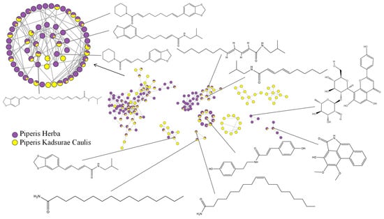 The molecular network was used for rapid identification of the compounds of Piperis Herba and Piperis Kadsurae Caulis, and the original mass spectral files of Piperis Herba and Piperis Kadsurae Caulis were imported into the MSConvert software of ProteoWizard 3.0.23199 64-bit and converted into the format of mzML, respectively. Then, the files were uploaded to the GNPS website (https://gnps.ucsd.edu/) (accessed on 2 November 2023) via WinSCP software 6.1. Molecular network analysis was performed by setting the precursor ion mass and fragment ion to 0.02 Da and the minimum cosine value to 0.07. The rest of the parameters were set according to the default settings and submitted to the molecular network run [31]. Cytoscape 3.9 was used to process the generated molecular network, and the compounds on the network were analyzed and identified.