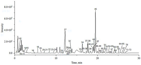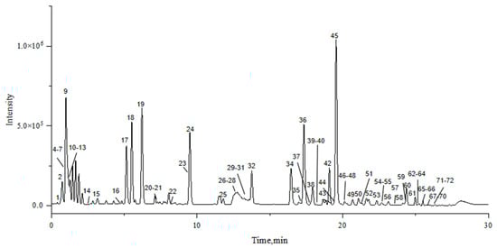 In this experiment, UPLC was firstly carried out to investigate the extraction solvents (water, 50% methanol, 75% methanol, and methanol), extraction time (15, 30, and 60 min), material–liquid ratios (1:25, 1:50, 1:100, and 1:200 w/v), and the gradient of the mobile phase (acetonitrile–water, methanol–water, acetonitrile–0.1% (v/v) formic acid in water). The results showed that choosing the material–liquid ratio of 1:100 for the extraction of 75% methanol for 30 min allowed for detecting the majority of the substances. Considering that the alkaloid compounds were almost unresponsive in the negative ion mode, the positive ion mode was finally adopted for the collection after comparison.