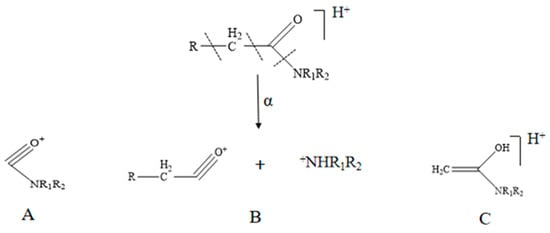 Schematic representation of three cleavage modes of amide alkaloids in positive ion mode. A (acyl carbon atom initiated α-cleavage), B (acyl nitrogen atom initiated α-cleavage) and C (γ-hydrogen rearrangement).
