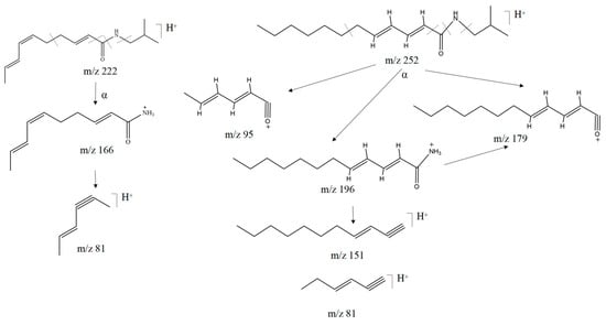The amide alkaloids of the isobutyl group can be divided into two classes, of which compounds 38, 45, 52, 60, 64, 70, and 72 are fatty amide alkaloids, which are cleaved mainly by class A and B α-cleavage in Figure 4. For example, compound 38 is cleaved by the oxygen and nitrogen atoms in the amide bond, generating a fragment peak with m/z 166 (C10H16NO+) due to the neutral loss of isobutyl, followed by the α-cleavage of the carbonyl group and the loss of the alkyl fragments, generating a fragment peak with m/z 81 (C6H8+). Compound 60 has a similar cleavage pattern, with the neutral loss of either isobutyl or m/z 73 (C4H11N) generating a fragment peak with m/z 196 (C12H22NO+) or 179 (C12H19O+), or through the loss of CO followed by alkyl fragmentation to generate a fragment peak with m/z of 95 (C6H7O+). The cleavage patterns of compounds 38 and 60 are shown specifically in Figure 5, and combined with the above analyses, the identification of the remaining fatty amide alkaloids was completed through the website and based on the literature.