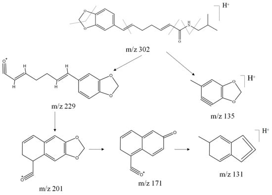 Compounds 18, 27, 34, 37, 40, 46, 48, 54, 58, 65, 66, 68, and 71 comprise a second class of isobutyl amido alkaloids characterized by the presence of the 1,3-benzodioxol-5-yl group and isobutylamine. These compounds also contain cleavage of the 1, 3-benzodioxol-5-yl group through the loss of CH2O to obtain a fragment ion with an m/z of 135 (C8H6O2+). Compound 34 is mainly cleaved by class A alpha cleavage to obtain a m/z of 229 (C14H13O3+), and the fragment ions with m/z of 201 (C12H9O3+), 171 (C11H7O2+), and 131 (C10H10+) were obtained through multiple rearrangements of hydrogen, respectively. On the other hand, there is also a structure containing the 1, 3-benzodioxol-5-yl group remaining after class B α-cleavage through loss of CH2O to obtain fragment ions with m/z of 135 (C8H6O2+), and the specific cleavage pattern is shown in Figure 6. Combining the two cleavage patterns, the remaining isobutyl alkaloids can be structurally characterized.