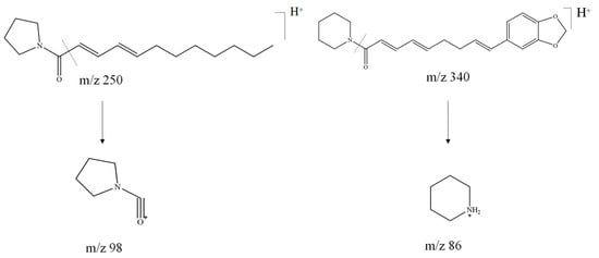 The amide alkaloids of the piperidine class, the most biologically important precursors that include the piperidinium salts, are characterized by cleavage by amide bond class B alpha cleavage to give characteristic fragment ions with m/z of 86 Da (C5H12N+), of which compounds 23, 25, 29, 30, 35, 36, 39, 47, 50, 53, 59, 61, 63, and 69 were identified as piperidine amide alkaloids. The amide alkaloids of the pyrrolidine class are similar to the amide alkaloids of the piperidine class, which include 19, 21, 24, 32, 51, 55, and 56, and their cleavage is characterized by a characteristic fragment ion with m/z of 72 (C4H10N+) via an amide bond via class B alpha cleavage, which, however, could not be detected due to the scanning range setting, but it can be identified by class A α cleavage to obtain m/z of 98 (C5H8NO+). The specific cleavage pathways exemplified by compounds 47 and 55 are indicated in Figure 7. The other piperidine and pyrrolidine alkaloids were resolved in combination with the isobutyl amide alkaloids.