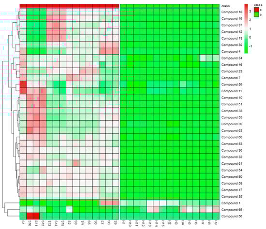 The differential compounds between 15 batches of Piperis Herba and 15 batches of Piperis Kadsurae Caulis were analyzed using a t-test, and the compounds with p < 0.05 were selected as differential compounds, from which 32 differential compounds were screened out and identified. The peak areas of the differential compounds of each batch were used as their relative contents to draw the clustering heatmap so as to achieve the intuitive description of the differential compounds of multiple batches. Among the 32 differential compounds screened, 29 alkaloids, 2 flavonoid glycosides, and 1 volatile oil compound were identified, except for compound 65, which had a higher relative content in Piperis Herba. The distribution of the differential compounds with amide alkaloids as the main compound was more abundant in Piperis Herba, and the quality of Piperis Kadsurae Caulis was less affected by the difference in origin relative to Piperis Herba. The quality of Piperis Herba from different origins was more varied than that of Piperis Herba from different origins, among which compounds 13, 18, 19, 37, and 42 had higher relative contents in Piperis Herba from Guangxi Yulin, while compounds 4 and 39 were widely distributed in Guangxi Baise. The compound from Yunnan Dali was the richest, and the compound from Guilin, Guangxi was the most abundant. The proportion of vine stems and leaves in them has some correlation. The majority of the three batches of Piperis Herba from Guangxi Guilin collected in this experiment was in the form of vine stems in S1, while a certain proportion of leaves were mixed in S2 and S3, which is possibly one of the reasons for the large differences in Piperis Herba. The results were analyzed and evaluated, and it was found that the relative content of the different compounds in Piperis Herba was higher as a whole, so it was possible to differentiate between Piperis Herba and Piperis Kadsurae Caulis in terms of compounds. It was also found that the quality of Piperis Kadsurae Caulis was relatively more stable and that Piperis Herba was used as vine stems for medicine, while Piperis Herba was used as leafy vine stems for medicine. The differences that existed between the vine stems and the leaves would bring about the difference in the compound, and then the difference in the efficacy of the medicine, which provides ideas for the stability of the quality of the Piperis Herba. The results were analyzed and evaluated, and it was found that the relative contents of the differential compounds were higher in Piperis Herba, thus distinguishing Piperis Herba and Piperis Kadsurae Caulis in terms of compounds. The heatmap of the differential compounds is shown in Figure 8.