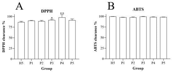 DPPH (A) and ABTS (B) antioxidant activity of Piperis Herba and Piperis Kadsurae Caulis ( ± s, n = 3), Annotations: Compare with H5, * p < 0.05, ** p < 0.005. Note: H5 is three batches of Piperis Kadsurae Caulis from Hubei Enshi. P1–P5 are individuals of three batches of Piperis Herba from different origins.