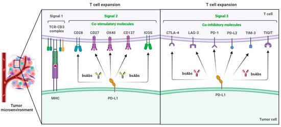 Co-inhibitory and co-stimulatory molecules involved in the development of anti-PD-L1-based bsAbs for cancer immunotherapy.