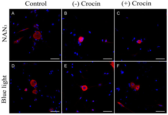 HO−1 protein detection in undamaged neurons from primary cultures of trigeminal ganglia (A,D) and after exposure to NaN3 (B) and blue light (E). (C,F) show the reduction in fluorescence intensity (HO-1 expression) in cultures treated with crocin for 24 h before exposure to NaN3 (C) and blue light (F). Nuclei were counterstained with DAPI. (Scale bars: 200 µm).