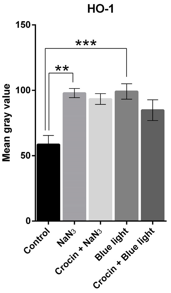 Graph shows the distribution of mean gray values (scaled 0 to 256) corresponding to the expression of HO-1 upon stimulation with NaN3 and blue light compared with crocin-pretreated cultures. A one-way ANOVA with Tukey’s multiple comparisons test was used for parametric data. (Statistical significance is represented by asterisks ** = p < 0.01; *** = p < 0.001).