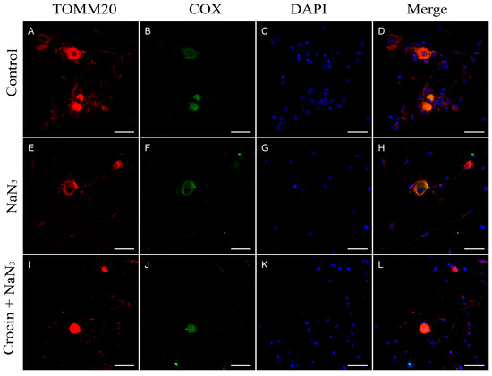 Immunostaining for TOMM20 and COX. (A–D) Neurons from primary cultures of trigeminal ganglia under normal conditions. (E–H) Cultures treated with NaN3 for 24 h. Note that in the case of cultures treated with NaN3, there is delocalization of cytochrome C and the mitochondrial marker TOMM20 (H). (I–L) Cultures pretreated with crocin before NaN3 damage. Nuclei were counterstained with DAPI. (Scale bars: 200 µm).