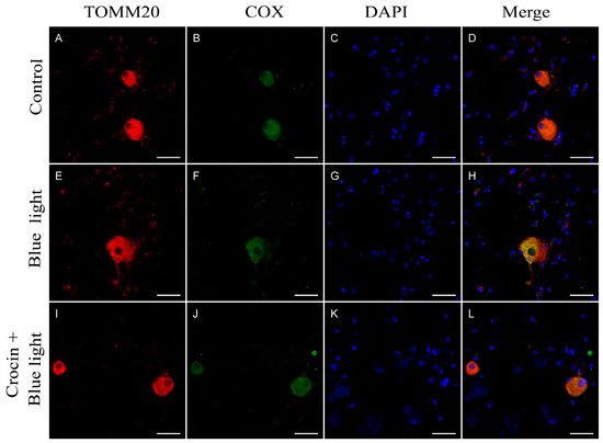 Cultures exposed to blue light for 24 h also showed COX immunofluorescence out of the mitochondria (Figure 4H). Treatment with crocin protected from COX cleavage, showing a correct colocalization of COX and TOMM20 (Figure 4L).