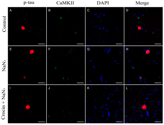 Expression of p-tau protein and CaMKII in neurons from primary cultures of trigeminal ganglia. (A–D) Images from control undamaged cultures showing normal morphology and level of expression of p-tau (A) and CaMKII (B). (E–H) Neurons exposed to NaN3 oxidative damage. Note the reduction in neurite number (E) and a slight increase in CaMKII immunofluorescence (F). Cultures pretreated with crocin (I–L) showed a significant higher number of neurites (I) and a basal expression of CaMKII (J). Nuclei were counterstained with DAPI. (Scale bars: 200 µm).