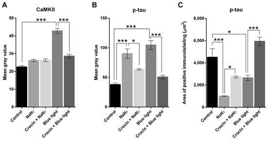 Graph (A) shows the distribution of mean gray values (scaled 0 to 256) corresponding to the expression of CaMKII upon stimulation with NaN3 and blue light compared with crocin-pretreated cultures. Graph (B) shows the distribution of mean gray values corresponding to the expression of p-tau protein upon stimulation with NaN3 and blue light compared with crocin-pretreated cultures. Graph (C) shows the relative density (area of positive elements/total area of the selection) corresponding to the expression of p-tau upon stimulation with NaN3 and blue light compared with crocin-pretreated cultures. A one-way ANOVA with Tukey’s multiple comparisons test was used for parametric data. (Statistical significance is represented by asterisks * = p < 0.05; *** = p < 0.001).
