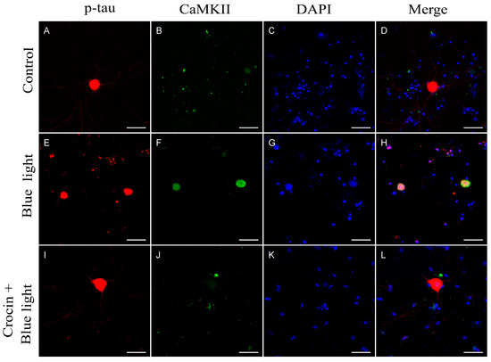 Expression of p-tau protein and CaMKII in neurons from primary cultures of trigeminal ganglia. (A–D) Images from control undamaged cultures showing normal morphology and level of expression of p-tau (A) and CaMKII (B). (E–H) Neurons exposed to blue light damage. Note the reduction in neurite number (E) and a sharp increase in CaMKII immunofluorescence (F). Cultures pretreated with crocin (I–L) showed a significant higher number of neurites (I) and a reduced expression of CaMKII (J). Nuclei were counterstained with DAPI. (Scale bars: 200 µm).