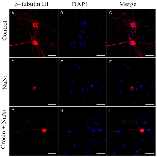 (A–C) Immunodetection of β-tubulin III in neurons from primary cultures of trigeminal ganglia under normal culture conditions. The addition of NaN3 to the culture medium induced abnormalities and a reduction in neurite density (D–F). Pretreatment with crocin for 24 h exerted a partial protective effect on the density of neuronal projections (G–I). Nuclei were counterstained with DAPI. (Scale bars: 200 µm).