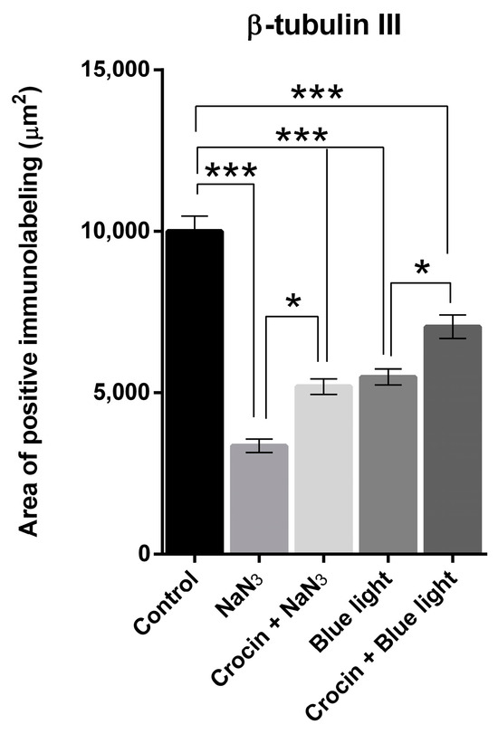 Graph shows the relative density (area of positive elements/total area of the selection) corresponding to the expression of β-tubulin III upon stimulation with NaN3 and blue light compared with crocin-pretreated cultures. A one-way ANOVA with Tukey’s multiple comparisons test was used for parametric data. (Statistical significance is represented by asterisks * = p < 0.05; *** = p < 0.001).