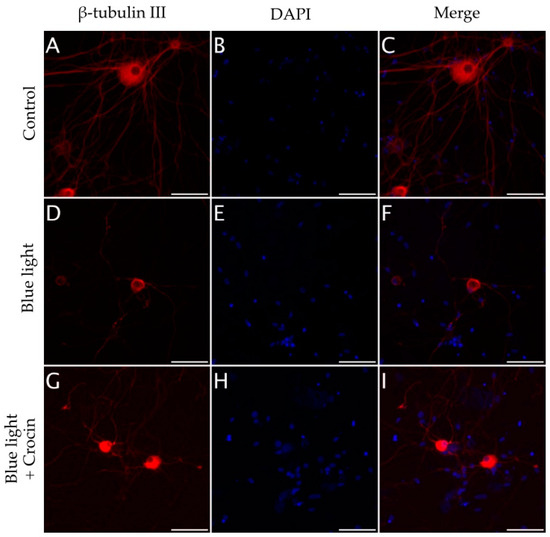 (A–C) Immunodetection of β-tubulin III in neurons from primary cultures of trigeminal ganglia under normal culture conditions. The exposure to blue light induced a reduction in neurite density (D–F). Pretreatment with crocin for 24 h exerted a partial protective effect on the density of neuronal projections (G–I). Nuclei were counterstained with DAPI. (Scale bars: 200 µm).