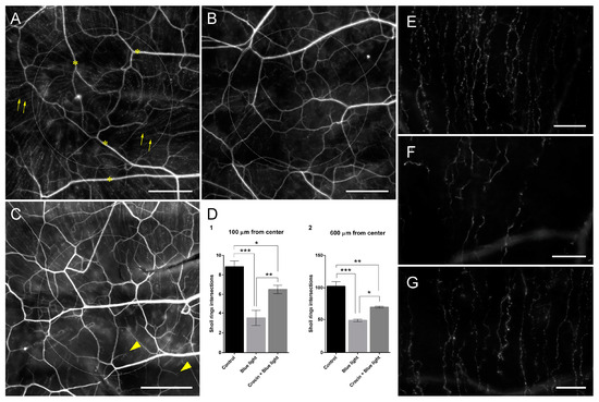 Whole mount preparations of rat corneas showing the corneal innervation of a control undamaged animal (A), a cornea exposed to blue light for 4 h over 10 days (B) and a cornea pretreated with topical 0.1 mM crocin over 3 days previous to blue light exposure (C). Arrows in (A) indicate sub-basal nerve fibers. Asterisks in (A) indicate stromal nerve bundles. Note the significantly higher density of sub-basal nerve fibers in (C) compared with (B) (see also (D)). Arrowheads in (C) indicate regenerative milieu at the tip of sub-basal nerve fibers. β-tubulin III immunofluorescence signal was artificially colored to gray in order to increase the visualization of the small sub-basal fibers. Dotted circles indicate the 600 µm Sholl ring. (D) Graphs showing the frequency of intersections of sub-basal nerve fibers with Sholl rings at 100 and 600 µm from the center. A one-way ANOVA with Tukey’s multiple comparisons test was used for parametric data. (E) Detail of sub-basal nerve fibers from image (A) (control undamaged) at the level of the 600 µm Sholl ring. (F) Detail of sub-basal nerve fibers from image (B) (exposed to blue light) at the level of the 600 µm Sholl ring. (G) Detail of sub-basal nerve fibers from image (C) (pretreated with crocin before blue light exposure) at the level of the 600 µm Sholl ring. Note the difference in fiber density between groups. (Scale bars in (A–C): 200 µm; scale bars in (E–G): 50 µm; statistical significance is represented by asterisks in (D): * = p < 0.05; ** = p < 0.01; *** = p < 0.001).