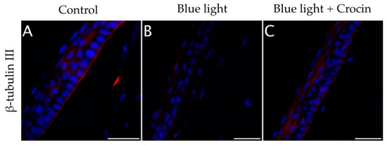 The loss of elements of the sub-basal nerve plexus was also observed in cross sections of the cornea of blue light-exposed rats (Figure 12B) in comparison with a control rat (Figure 12A). Crocin-pretreated corneas showed positive β-tubulin III immunolabeling at the level of the sub-basal plexus, just beneath the epithelium, indicating a partial neuroprotective effect for 0.1 mM crocin applied topically (Figure 12C).