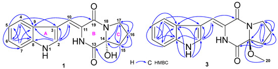 Figure 2. Key HMBC correlations of asperindopiperazines A (1) and C (3).