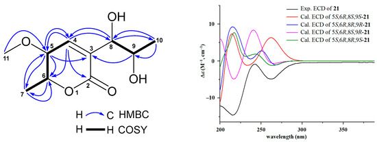 Compound 21 showed HRESIMS ion peaks at m/z 217.1072 [M + H]+ (calcd for C10H17O5, 217.1076) and 239.0897 [M + Na]+ (calcd for C10H16NaO5, 239.0895), suggesting a molecular formula C10H16O5. Compound 21 shared similar UV absorptions with those of the known compounds 19 and 20, implying they are aspyrone analogues. Interpretation of its 13C, 1H, HMQC, and HMBC NMR spectra indicated that 21 had one carbonyl (δC 163.2), two olefinic carbons (δC 146.2 and 128.2), four oxymethines (δC 82.1, 77.9, 68.0, and 66.7), one methoxy (δC 57.0), and two methyls (δC 18.5 and 17.6). Further comparison of its NMR data with those of 19 (Table S8) showed that both 21 and 19 exhibited very similar patterns of NMR chemical shifts, exception for that the methylene (δC 39.7; δH 2.44, 2.40) at C-8 in 19 was replaced by an oxymethine (δC 77.9; δH 4.15) in 21 and additional NMR signals (δC 57.0; δH 3.20) for a methoxy group were observed in the NMR spectra of 21. HMBC correlation (Figure 3) of H-11 (δH 3.20) with C-5 (δC 82.1) determined this methoxy group at C-5 position. The absolute configurations of 21 were assigned based on the results from ECD and 13C NMR calculations [37,38]. Because all previously reported aspyrone analogues [30,31,39,40,41] including compounds 19 and 20 shared the same 5S,6R-configuration, only four model molecules of 5S,6R,8S,9S-21, 5S,6R,8R,9R-21, 5S,6R,8S,9R-21, and 5S,6R,8R,9S-21 were applied for ECD calculations. The results (Figure 3) indicated that the experimental ECD spectrum was in agreement with the calculated ECD curve of the model molecule 5S,6R,8S,9R-21, suggesting a 5S,6R,8S,9R-configuration for 21, which was further supported by the results from 13C NMR calculations. As shown in Table S24, the experimental 13C NMR data of 21 were close to those of the model molecule of 5S,6R,8S,9R-21 with a DP4+ probability score of 98.87%. Therefore, the structure of 21 was identified as 5-methoxy-8,9-dihydroxy-8,9-deoxyaspyrone, a new member of the aspyrone family with a 5S,6R,8S,9R-configuration, which was the same as that of a reported compound of 8,9-dihydroxy-8,9-deoxyaspyrone [40,41]. The 13C and 1H NMR data (Table 2) of 21 were unambiguously assigned based on the HMQC, COSY, and HMBC correlations (Figure 3).