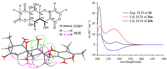 The HRESIMS spectrum of compound 26 gave ion peaks at m/z 437.1821 [M + H]+ (calcd for C22H29O9, 437.1812) and 459.1631 [M + Na]+ (calcd for C22H28NaO9, 459.1631), corresponding to molecular formula C22H28O9, which is the same as that of aspertetranone D (25). Careful analyses of the 1H, 13C, COSY, and NOESY spectra of 26 and comparing its NMR data (Table 2) with those (Table S10) of 25 concluded that the only difference between 26 and 25 was the configuration at the C-12 position. The larger coupling constant of 9.0 Hz (3J11a-12) in 26 and the small coupling constant of 3.9 Hz (3J11a-12) in 25 suggested a trans-configuration between H-11a and H-12 in 26 compared to its counterpart with a cis-configuration in 25. The relative configurations of 26 were further supported by NOE information. As depicted in Figure 4, NOE correlations of H-6 (δH 4.23) with OH-6a (δH 6.69) and H3-15 (δH 1.26), H-11 (δH 1.87) with OH-6a and H3-15, and H3-15 with OH-6a and H-12 (δH 4.36) suggested an α-orientation for these protons, while the β-orientations for OH-6, OH-10a, H-11a, OH-12, and H3-18 were indicated by NOE correlations of OH-6 (δH 6.62) with H-11a (δH 2.12), OH-10a (δH 4.86) with H-11a and H3-18 (δH 1.10), H-11a with OH-12 (δH 4.76) and H3-18, and OH-12 with H3-18. A combination of ECD and 13C NMR calculations was used to determine the absolute configuration of 26. Two model molecules of 5aS,6R,6aR,10aR,11R,11aS,12S (26a) and 5aR,6S,6aS,10aS,11S,11aR,12R (26b) were applied for ECD and 13C NMR calculations, respectively. As shown in Figure 4, the experiment ECD spectrum of 26 was close to the calculated curve of the model molecule 26a, indicating 26 had a 5aS,6R,6aR,10aR,11R,11aS,12S-configuration, which was further supported by the results of the 13C NMR calculations with a DP4+ probability score of 77.86% (Table S29). Therefore, the structure of 26 with a β-OH group at C-12, an analogue of 25, was elucidated as a new putative meroterpenoid [33], named 12S-aspertetranone D. Its 13C and 1H NMR are reported in Table 2.