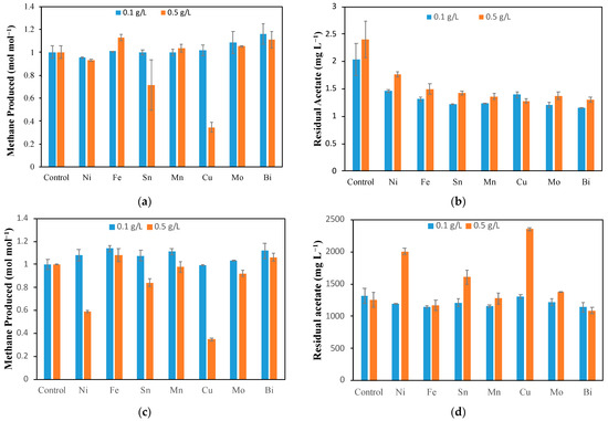 Figure 1d shows the residual acetate in the bottles after the end of the experiment. At 0.1 g L−1, comparable amounts of acetate were used for all the metal ions and control. However, at 0.5 g L−1, we see more residual acetate for Ni, Sn, and Cu. Table S1 (in Supplementary Materials) shows the amount of acetate used, the amount of CH4 produced, and the ratio of CH4 produced to acetate used. This ratio was about one for all the bottles at both concentrations, which is consistent with the expected reaction stoichiometry (Equation (5)), indicating that although Cu, Ni, and Sn reduced the rate of acetate conversion to CH4, the conversion stoichiometry of this microbial biotransformation was not affected. This also suggests that in the biotransformation of acetate, only CH4 is predominantly formed even though there were other microbial species present other than acetoclastic methanogen.