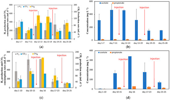 From Figure 2d, with the first injection, it is evident that acetate levels increased to 341 mg L−1 before following a decreasing trend, indicating that the injection of Sn caused a temporary increase in acetogenic activity. Acetate levels eventually decreased to 177 ± 96 mg L−1 between days 17 and 23. Unlike the first injection, there was no short-term increase in acetate concentration after the second injection; however, there was a decrease to 71 ± 10 mg L−1.