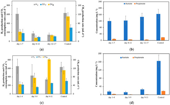 (a) H2 and CH4 production and CO2 consumption rates (mL d−1), (b) VFA concentrations (mg L−1) measured during the MESC operation with two Bi ion injections. (c) H2 and CH4 production and CO2 consumption rates (mL d−1), and (d) VFA concentrations (mg L−1) measured during the MESC operation with two Sn ion injections.