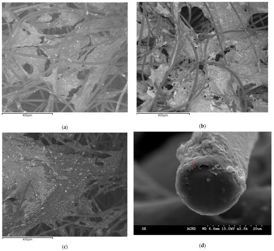 Following the end of each of these experiments, pieces of the cathode were sent for SEM imaging. Figure 4 depicts sample SEM images showing the presence of a biofilm on the Sn- and Bi-modified carbon felt cathode. As can be seen in Figure 4a–c, the biofilm blocked some of the pores of the carbon felt, thus limiting CO2, carbonate, and proton transport into the 3D carbon felt cathode, potentially limiting the rate of CO2 conversion. Similarly, the diffusion-limited transport of CO2 conversion products and H2 could be detrimental to the overall rate of CO2 conversion, as the accumulation of products and high local pH inside the carbon felt limited bioelectrochemical reactions. This indicates that this could have been a contributing factor to the limited CO2 conversion since blocked pores mean that CO2/CO32− does not have access to the microorganisms grown within the carbon felt pores. Figure 4d shows a tip of the carbon felt strand of the Bi-modified experiment with grown biofilm. The biofilm thickness could be estimated to be about 24 μm.