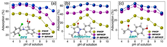 There is a statistically significant effect of the pH level on the adsorption process, mainly in terms of the surface charge and morphology of the adsorbent [31]. Exploring the optimal pH conditions for the adsorption of various PPCP yields crucial insights. These insights are essential for designing efficient and environmentally friendly treatment methods for wastewater containing these contaminants. The equilibrium concentrations of the samples were assessed with a standard curve, and the linear Beer–Lambert relationship was given through the calibration plot of absorbance versus the concentration, as shown in Figure S1. Figure 2 demonstrates the effect of pitch-based HCPs on the adsorption efficiency (%) of three PPCPs (DFS, AMP, and antipyrine) at different pH levels (4~10). The results showed a significant increase in the adsorption efficiency with an increasing pH level, reaching a maximum level of efficiency at the pH levels of 5, 6, and 7 for DFS, AMP, and antipyrine, respectively. In the case of a relatively low pH level (<4), the lower adsorption rate of the adsorbents is attributed to the fact that the protonated forms of all PPCPs may limit interaction with the surface of the protonated adsorbent. With a higher pH level, the deprotonated forms of PPCPs may weaken interaction with the surface sites of the adsorbent due to the increase in the concentration of free hydroxyl ions in the aqueous solution, thereby leading to a decrease in the adsorption performance [32]. Therefore, further adsorption studies were carried out at the optimal pH levels of 5, 6, and 7 for DFS, AMP, and antipyrine, respectively.