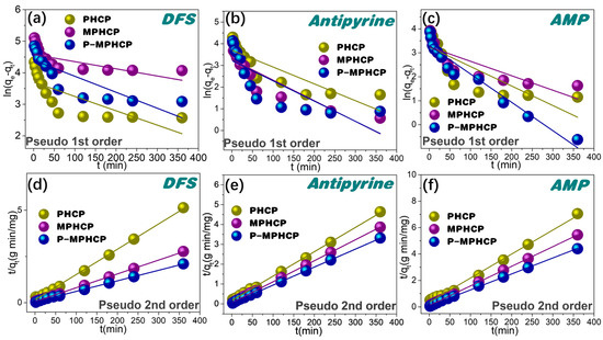 Adsorption kinetics for pitch-based HCP adsorbents onto PPCPs fitted with the pseudo-first order kinetic models of (a–c) and the pseudo-second order kinetic models of (d–f).