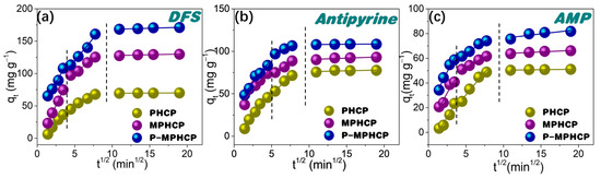 Weber–Morris intraparticle diffusion model for PHCP, MPHCP, and P-MPHCP toward DFS (a), antipyrine (b), and AMP (c) at initial concentrations of 200 mg L−1.