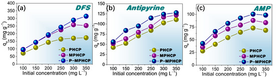 To investigate the effect of the initial concentration on the adsorption capacity of the adsorbents, isothermal equilibrium adsorption experiments were conducted at the optimal pH solution. These experiments covered a range of initial PPCP concentrations from 100 to 350 mg L−1. Figure 6, Figures S2 and S3, depict the influence of the initial PPCP concentration on the adsorption capacity at temperatures of 25, 35, and 45 °C, respectively. Comparing the adsorption properties of the three pitch-based adsorbents onto PPCPs, P-MPHCP showed the most exceptional adsorption capacity. This was followed by MPHCP and finally PHCP, which was neither magnetized nor modified and showed the weakest adsorption capacity. For instance, the adsorption efficiency of DFS in solution was significantly high for all pitch-based HCPs (≥94%) at concentrations ranging from 100 to 200 mg L−1. At lower solution concentrations, the introduction of phenolic hydroxyl groups did not significantly affect the adsorption. This could be attributed to the availability of more adsorption sites than needed. When the initial concentration was set at 350 mg L−1, the maximum adsorption capacities for DFS onto PHCP, MPHCP, and P-MPHCP were found to be 173.20, 253.38, and 316.78 mg g−1, respectively. It is indicated that the introduction of the carboxyl and phenolic hydroxyl groups after magnetic functionalization does indeed enhance the adsorption capacity of the adsorbent onto PPCPs. Moreover, all three adsorbents showed a consistent trend in the adsorption capacity to PPCPs along the order of DFS > antipyrine > AMP.