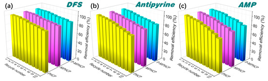 Cycled adsorption/desorption runs of PHCP, MPHCP, and P-MPHCP for DFS (a), antipyrine (b), and AMP (c).