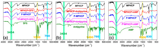 The hydroxyl groups on the surface of the pitch-based adsorbent act as hydrogen donors. In turn, the oxygen or nitrogen atoms in the PPCPs serve as hydrogen acceptors, resulting in a dipole–dipole hydrogen-bonding interaction. Another type of hydrogen bonding, known as Yoshida-type, occurs between the hydroxyl groups of adsorbents and the aromatic rings of the PPCPs [55]. As depicted in Figure 10, similar stretching bands were observed at 760, 830, and 1500 cm−1 for both PPCPs and PPCP-adsorbed MPHCPs, confirming the presence of adsorbed PPCPs in pitch-based adsorbents. It becomes evident that following the adsorption process, the band corresponding to hydroxyl groups (at 3434 cm−1) exhibited a reduced intensity. This reduction confirms the presence of hydrogen-bonding interactions between the PPCPs and the pitch-based adsorbents. Notably, the decrease in intensity was more pronounced for P-MPHCP compared with MPHCP, possibly due to OH interactions [56].