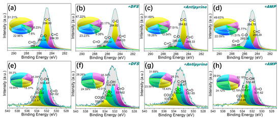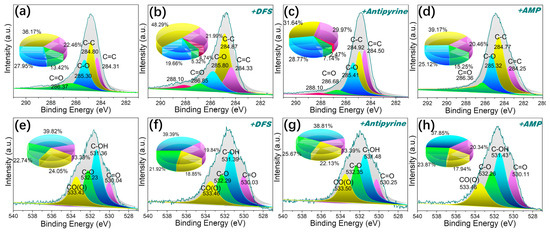 The XPS spectra of C1s (a–d) and O1s (e–h) for MPHCP before and after PPCP adsorption.