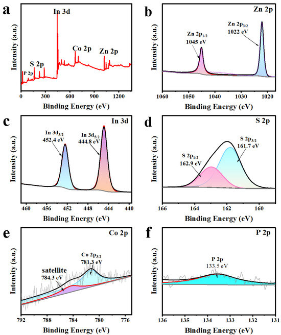 The chemical composition and elemental states of Z5CP composite are further determined by X-ray photoelectron spectroscopy (XPS). As presented in Figure 3a, Zn, In, S, Co, and P elements exist in the hybrid products, which further demonstrates the successful photodeposition of Co-Pi on the surface of ZIS nanoflower. As shown in Figure 3b, the XPS spectrum of Zn 2p exhibits two distinct peaks at 1045 and 1022 eV, which correspond to the binding energies of Zn 2p1/2 and Zn 2p3/2 of Zn2+, respectively. From the XPS spectrum of In 3d (Figure 3c), two peaks that center on binding energies 452.4 and 444.8 eV are respectively associated with In 3d3/2 and In 3d5/2, which indicate the +3 state of In. Moreover, as presented in Figure 3d, the peaks of 162.9 and 161.7 eV belong to S 2p1/2 and S 2p3/2, confirming the presence of S2−. In the XPS spectrum of Co 2p (Figure 3e), the peak of Co 2p3/2 is at 781.3 eV (satellite peak at 784.3 eV), indicating the presence of Co2+ in the Z5CP composite [43,44,45]. In addition, the peak of P 2p (Figure 3f) at 133.5 eV indicates that P presents in the form of phosphate groups, which further proves the successful synthesis of Z5CP [46].