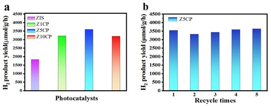 Photocatalytic H2 production is performed with triethanolamine (TEOA) as the hole scavenger, and the photocatalytic properties of pure ZIS and different proportions of ZIS/Co-Pi composites under visible light are investigated. Figure 4a is a diagram of the photocatalytic activity of ZIS and composite with 1%, 5%, and 10% Co-Pi (hereinafter shown as Z1CP, Z5CP, and Z10CP, respectively). As shown in Figure 4a, due to the fast photogenerated electron–hole recombination rate, the pure ZIS is less active and the H2 evolution rate is only 1832 μmol∙g−1∙h−1. After the introduction of Co-Pi cocatalyst, Z1CP, Z5CP, and Z10CP all show better H2 evolution performance compared with blank ZIS. With the increase in Co-Pi content, the hydrogen yield increases gradually. However, when the Co-Pi content increases further, the H2 evolution activity decreases, which may be due to the remarkable shielding effect of Co-Pi, thereby decreasing the photocatalytic active sites [47]. In particular, the Z5CP composite shows the highest H2 evolution rate (3593 μmol∙g−1∙h−1), approximately two times higher than that of ZIS alone. This can be attributed to the fact that in situ photodeposition of Co-Pi promotes the transfer of photogenerated holes and reduces the recombination rate of photogenerated carriers. As shown in Table 1, the Z5CP composite prepared in this work has optimal photocatalytic H2 production properties compared with the photocatalytic H2 production activities of some representative ZIS-based composites reported in recent years. In addition, the stability of Z5CP is tested by the cyclic test. As depicted in Figure 4b, after five cycles, no apparent deactivation has been observed for Z5CP composite, indicating the excellent stability of Z5CP composite.