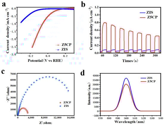 Photo/electrochemical tests are used to further characterize material reducing capacity and photogenerated carrier transfer efficiency. Linear sweep voltammetry (LSV) is first used to determine the H2 evolution performance of ZIS and Z5CP samples. Figure 5a shows the polarization curve of ZIS and Z5CP composites. It can be seen that the overpotential of Z5CP is less than ZIS at the same current density, indicating that the H2 evolution performance of Z5CP is better than that of ZIS [48]. The kinetics of photocatalysis in different samples can be compared by the Tafel slope. As shown in Figure S3, the Tafel slope of the Z5CP composite (0.21 V/decade) is smaller than that of ZIS (0.24 V/decade), indicating the better reduction effect and interfacial charge transfer efficiency of Z5CP, which is consistent with the photocatalytic H2 production activity as well as other characterization results [49]. These results further demonstrate that Z5CP has faster reaction kinetics and excellent interface carrier separation efficiency. To study the charge separation and transfer of these ZIS/Co-Pi composites, instantaneous photocurrent (IT), electrochemical impedance spectroscopy (EIS) and steady-state photoluminescence (PL) spectra are measured on the ZIS and Z5CP samples [50]. As illustrated in Figure 5b, the optical current density of ZIS is small, indicating that the photogenerated carrier separation efficiency of ZIS is poor. However, it is found that after the introduction of Co-Pi, the optical current density of Z5CP is significantly improved compared with that of pure ZIS, indicating that Z5CP has better separation efficiency of electron (e−) and hole (h+) [51,52,53,54,55]. As shown in Figure 5c, the radius of curvature of Z5CP composite is smaller than ZIS, indicating that the charge transfer resistance of Z5CP is lower, which improves the separation and transfer rate of photogenerated carriers, thus enhancing the photocatalytic activity [56,57,58,59,60]. Furthermore, Figure 5d describes the steady−state photoluminescence (PL) spectra test of the sample. As shown in Figure 5d, the PL intensity of Z5CP is significantly lower than that of blank ZIS, indicating that the addition of cocatalyst Co-Pi effectively inhibits the recombination of photogenerated carriers [61,62,63,64,65]. Taken together, the results of these photo/electrochemical tests validate the improved separation and transfer of photogenerated charges in Z5CP, leading to the enhanced performance of photocatalytic H2 evolution.