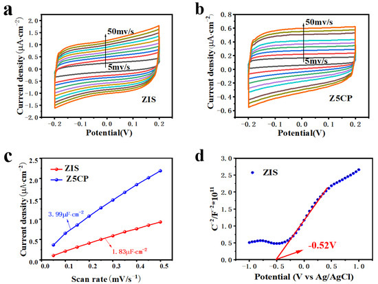 The information of chemical reaction area of the blank ZIS and the composite material Z5CP is obtained by the cyclic voltammetry test (CV). Figure 6a,b show the cyclic voltammetry (CV) curves of the blank ZIS and Z5CP composites, respectively. As illustrated in Figure 6c, the double-layer capacitance of Z5CP composite (3.99 μF·cm−2) is significantly larger than ZIS (1.83 μF·cm−2), which strongly proves that Z5CP has more active sites area than ZIS [45]. In addition, the flat charged position (Efb) of the original ZIS is measured with Mott–Schottky (MS). Generally, the slope of the positive one indicates that the semiconductor is an intrinsic n-type semiconductor [51]. As can be seen from Figure 6d, ZIS belongs to the n-type semiconductor. Moreover, Figure S4 shows the detailed fitting parameters of MS. According to the x-intercept of the block, its Efb is determined to be −0.52 V (vs. Ag/AgCl). In general, the conduction band position of n-type semiconductors is about 0.2 V more negative than that of Efb [66,67,68]. Therefore, the conduction charge position (ECB) of the ZIS is −0.72 V (vs. Ag/AgCl). From the formula ENHE = EAg/AgCl + 0.20 V, the ECB of ZIS is −0.52 V (vs. NHE). According to the band gap of ZIS (2.44 eV), the valence band potential (EVB) of ZIS is 1.92 V (vs. NHE).
